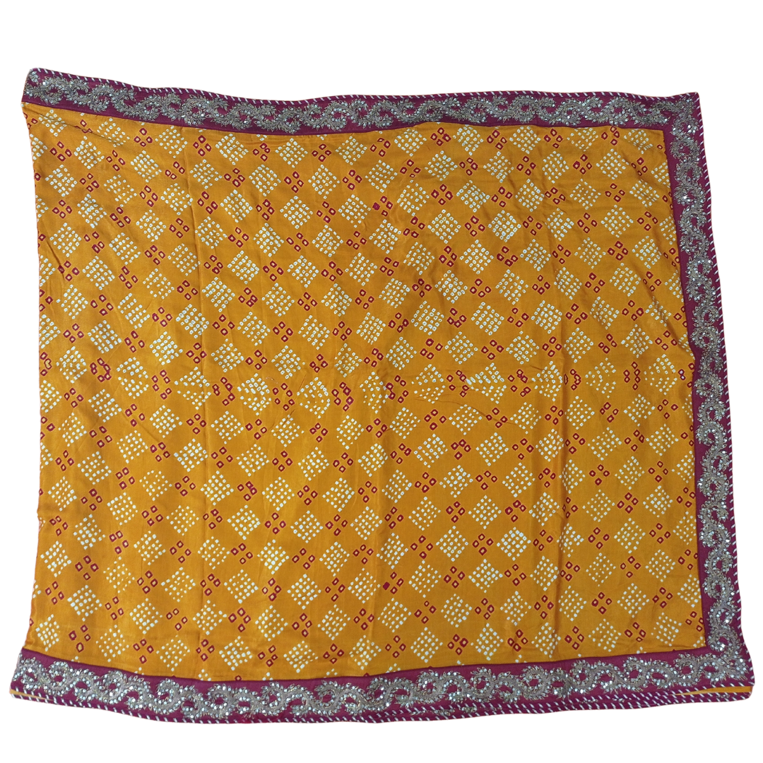 Step into timeless tradition with this radiant Mustard Bandhani Gajji Silk Saree, enriched with beautiful hand work that reflects the rich heritage of Indian craftsmanship. The luxurious gajji silk fabric offers a soft, glossy texture, while the classic Bandhani tie-dye patterns add depth and cultural elegance.